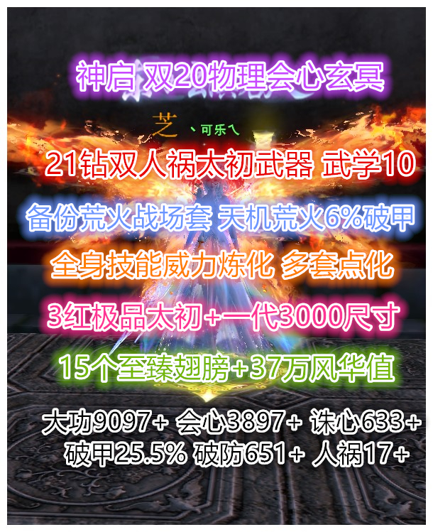 神启【双20/会心太虚】21钻双人祸太初 全满威力炼化 大法8925+ 会心4141+ 诛心690+ 透魔29.1% 人祸18%+ 知彼25+ 全8级马丹 3红极品太初翅膀 土豪马