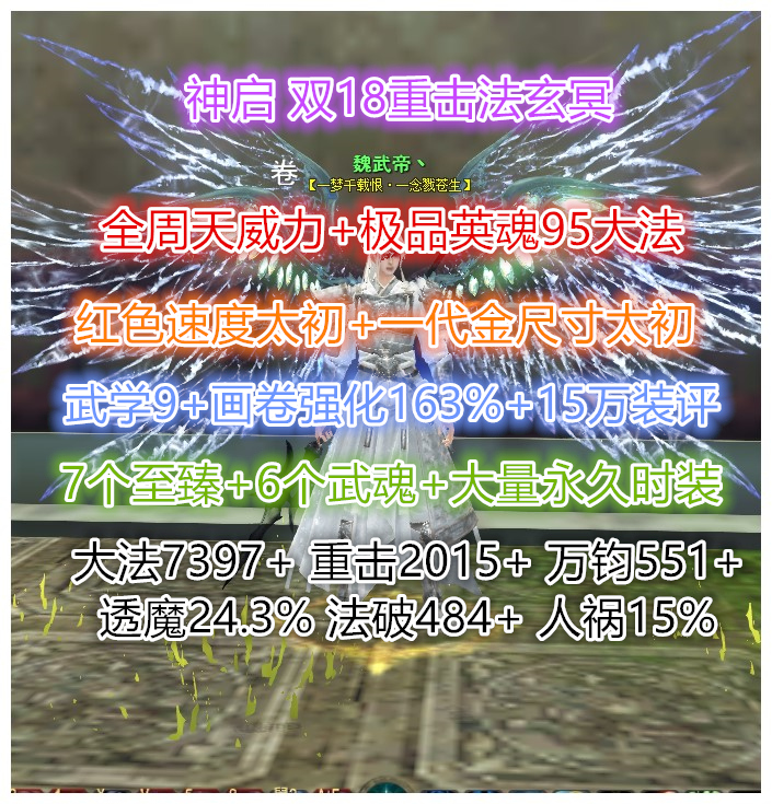神启【双18/法系玄冥】全周天技能 红速度太初翅膀 孩子3魂太初 太虚魂剑副手(6%+5.5%透魔) 6~7天魄 裸大法7391+ 重击2015+ 万钧551+ 透魔24.3% 破防484+ 人祸15+ 极品英魂(魂104+ 大法95+)