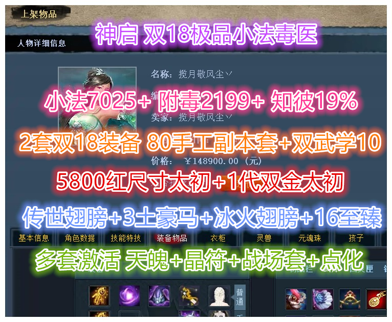 神启【双18/小法毒医】极限小法7025+ 附毒2199+ 人祸15 双孩子武学10 2套双18装备 无封钻 副本秒伤高 5800尺寸太初翅膀 传世 +3个土豪马 月下来客 风华值30万+