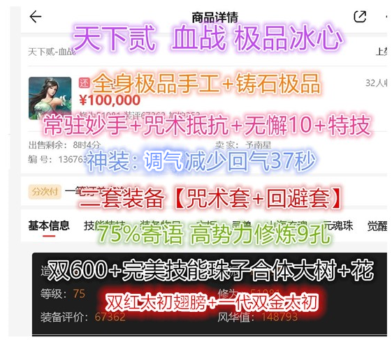 【血战】 极品冰心 75%寄语 全身完美穿刺化解炼化 多套特技装备(咒术防护+无懈.10+妙手 ) 5个江湖 势力修炼9孔(超高属性) 神装备调气-37秒回气 双红太初翅膀+一代双金太初翅膀+双合体