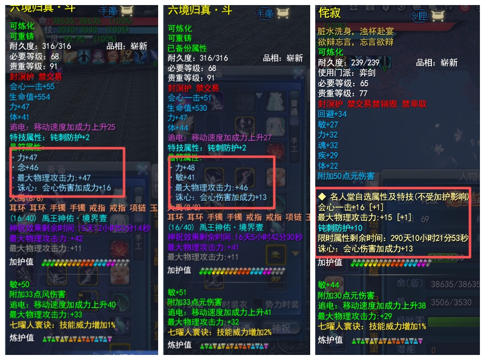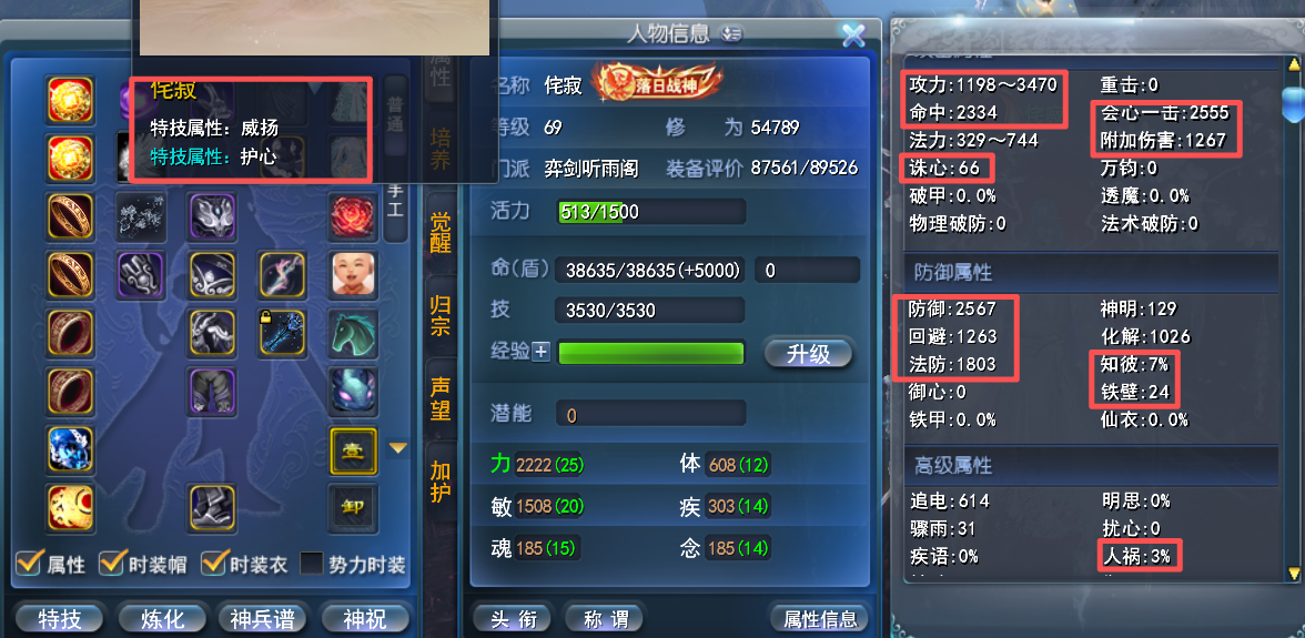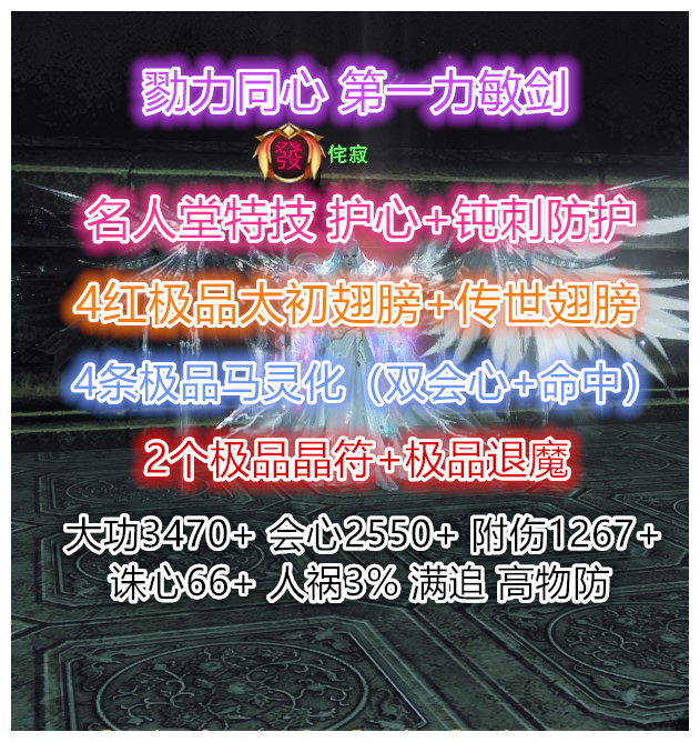 69勠力同心【名人堂力敏剑】名人堂翅膀特技:护心+钝刺 副手属性词条(会心 大攻 诛心) 全身极品退魔装备(全威力炼化)武库冲名人堂装备 3匹3技能 80级 全贰境界技能 极品英魂(敏93 大攻121)双大禹手镯激活极品 大攻3470+ 会心2555+ 附伤1267+ 知彼7% 人祸3% 满追电 大年卡2027年6月