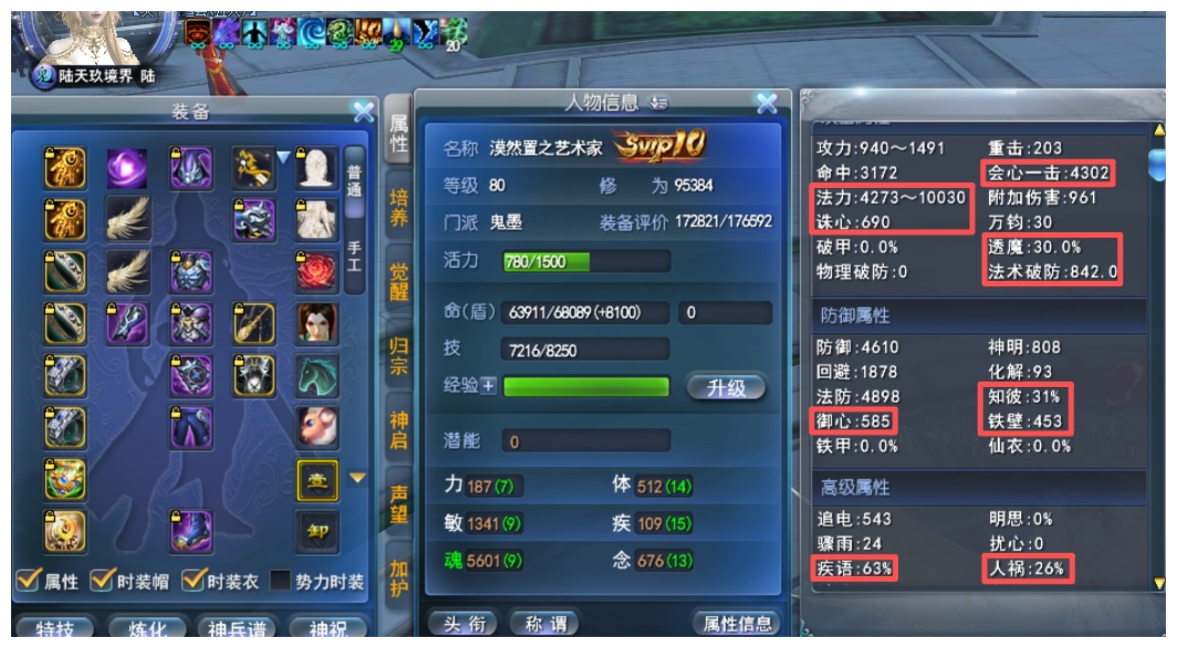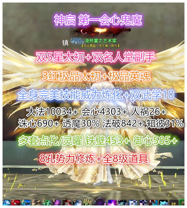 神启名人堂 第一会心鬼魔 双名人堂副手(元系精通+意志防护)5星双人祸太初 孩子五星太初 全身21钻 全身全技能威力(鬼泣10%)大法10034+ 会心4303+ 诛心690 透魔30% 法破842+ 人祸26% 极品手工时装(双诛心32+大生命满)画卷近全满强化193%(8个8级灵曜 双透魔+双御心) 势力修炼8孔高满 极品马灵化(双诛心8级马丹)大年卡2027年 双孩子武学10 名人堂翅膀(特技:射程) 大年卡2027年12月 极品英魂(魂101+ 大法139+)