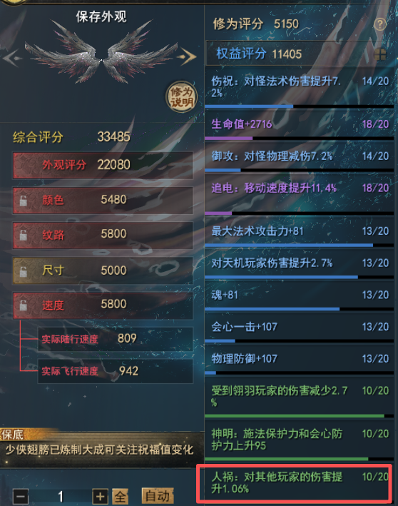 满钻孩子 +5星极品太初 + 武学10 + 4个天魄8级(3个双透魔) + 极品三套点化(双透魔+双明慧 6个铁壁点化) + 极品双会心天书8级(参悟5.7%透魔)+ 孩子翅膀双诛心+诛心铁壁