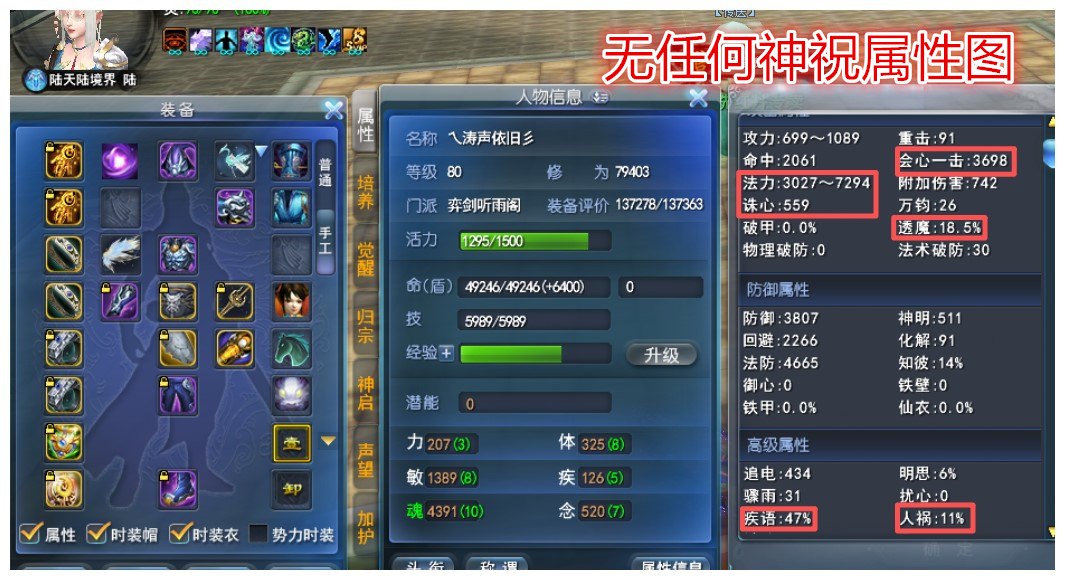 神启18钻魂剑 完美附伤炼化(4个大炮威力) 副手5.5%透魔 武器20钻 无神祝大法7294+ 会心3698+ 诛心559+ 透魔18.5% 人祸11%+ 手工时装(双32诛心) 双大禹手镯极品 画卷强化124%近双满 势力修炼7孔(差一个碎片8孔修炼) 武库2件战场套+3代九代武器 仓库:大量彩蛋+提升道具等