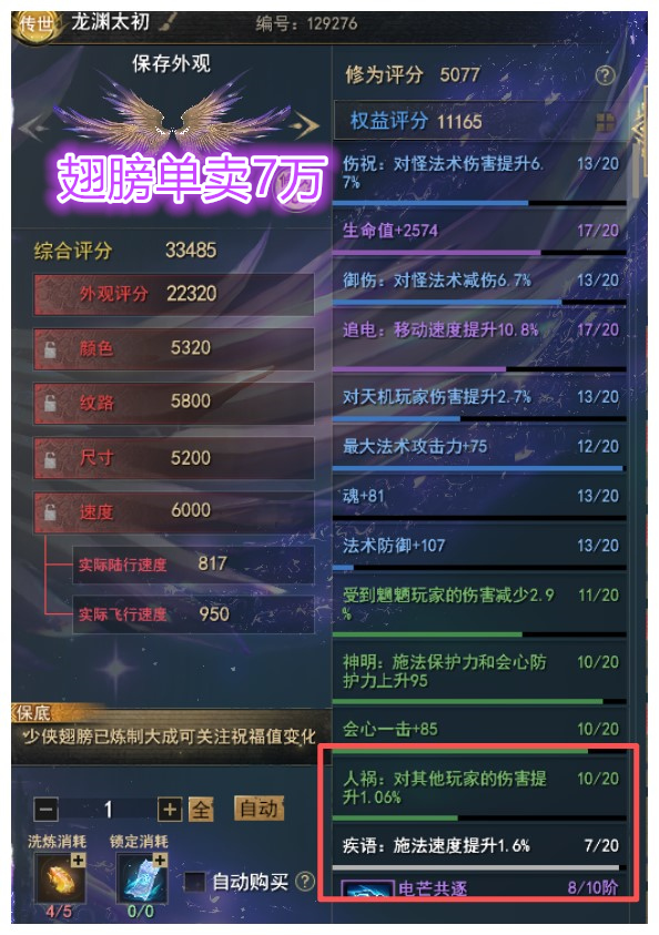 4红6000速度极品太初翅膀(人祸+寄语属性)(单卖7万) + 传世翅膀 + 6个至臻翅膀 (仓库48个艳流彩)+ 17个武魂 + 大量永久时装