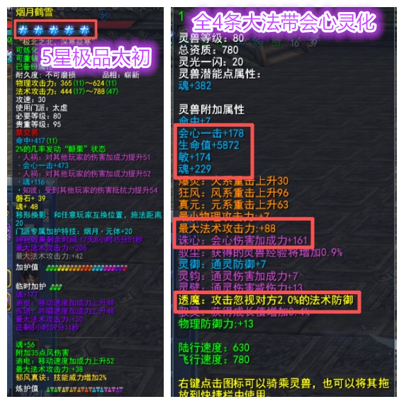 3魂极品太初 + 武学10 + 4个天魄8级 + 极品三套点化(双透魔+双明慧+双诛心) + 极品双会心天书7级(参悟4.2%透魔)+ 孩子翅膀 双诛心+双诛心