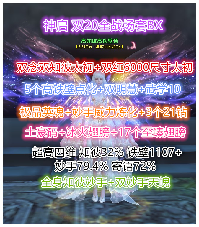 神启全战场极品BX 双知彼太初武器 全战场套32知彼+ 妙手加成79.4% 超高四维 铁壁1107+ 寄语72% 二个马灵化+手工套+世界套+战场套 天魄7~8级(知彼妙手+装评 二套天魄)