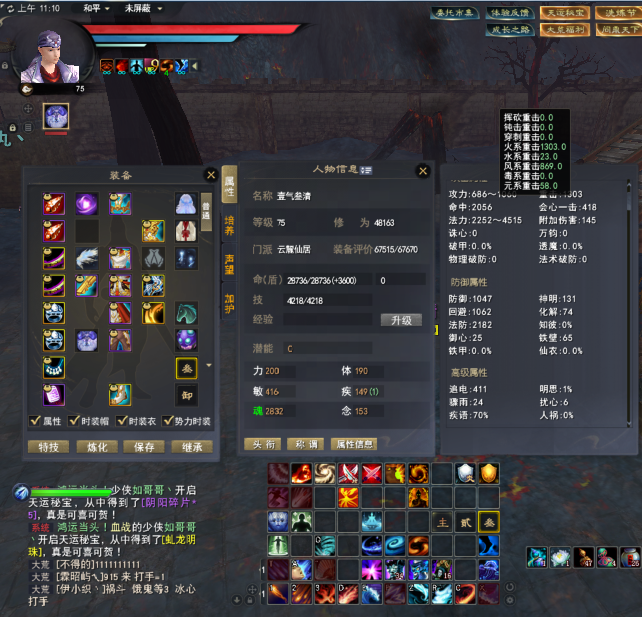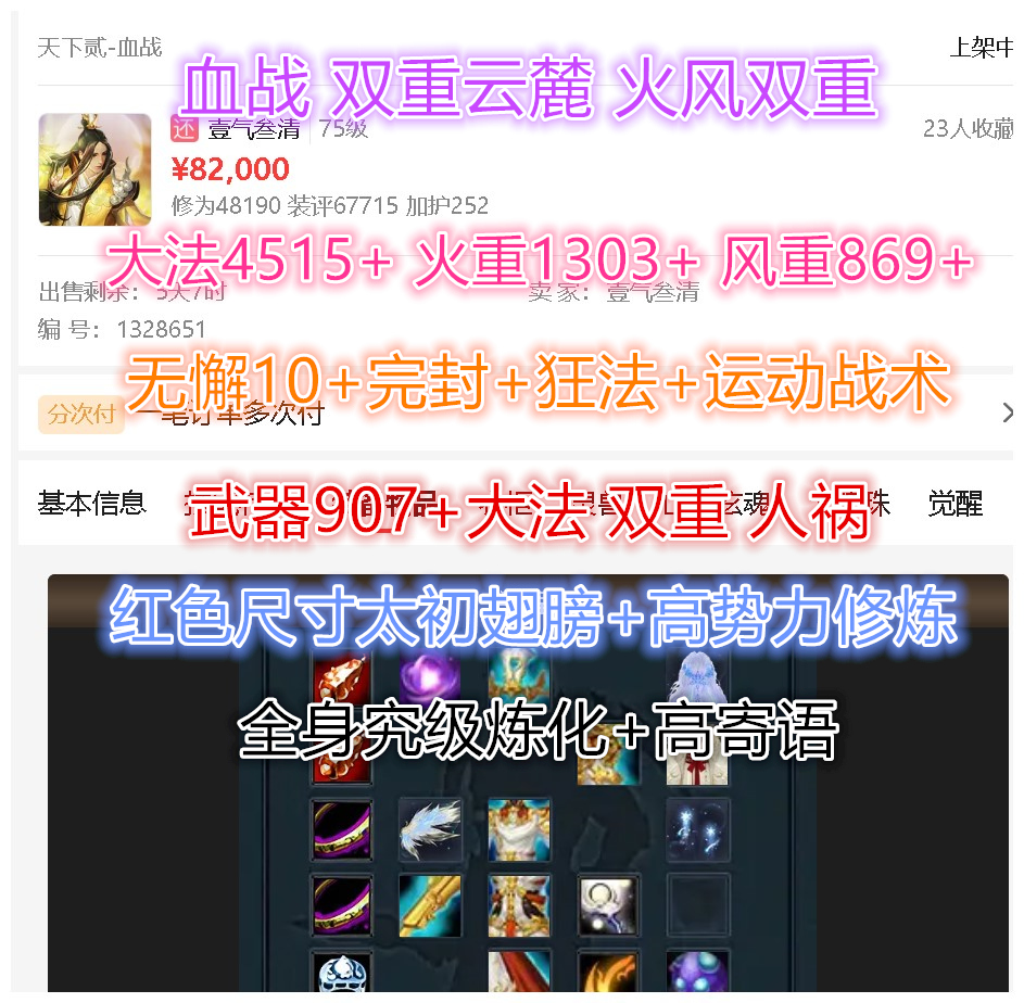 【血战】 双重云麓 常驻特技: 范围 + 无懈10+完封+狂法 可切换:运动战术 大法4515+ 火重1303+ 风重869+ 寄语70% 【武器907大法 双重 人祸】 极品手工装备【高寄语魂/双重魂】全身究级高寄语炼化 4个江湖【贰境界】+叁境界新江湖 势力修炼高8孔+觉醒等级高(无懈10+)80级贰境界火马 彩蛋:大量高价值手工套(3仓库)+ 运动战术套