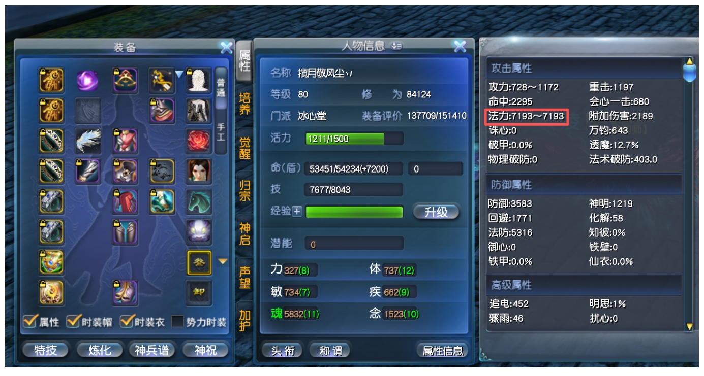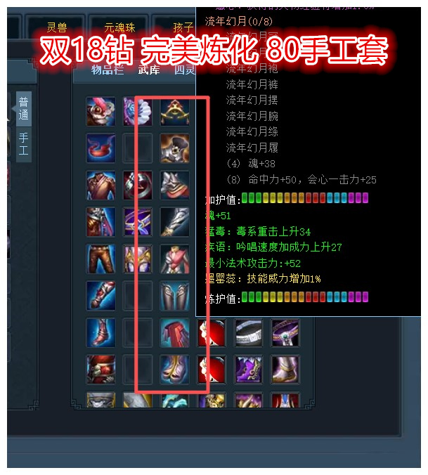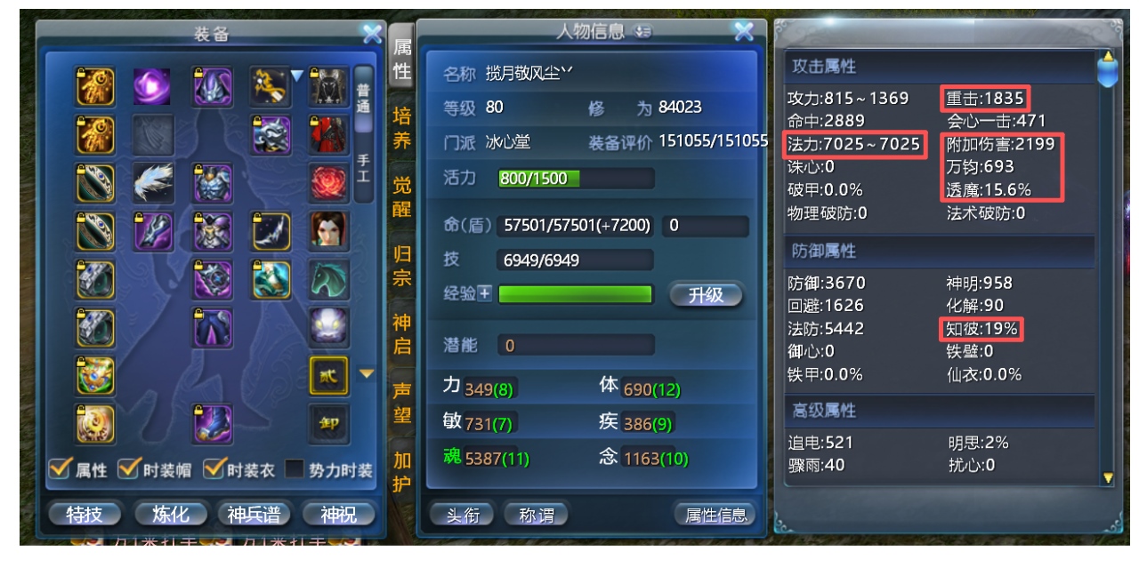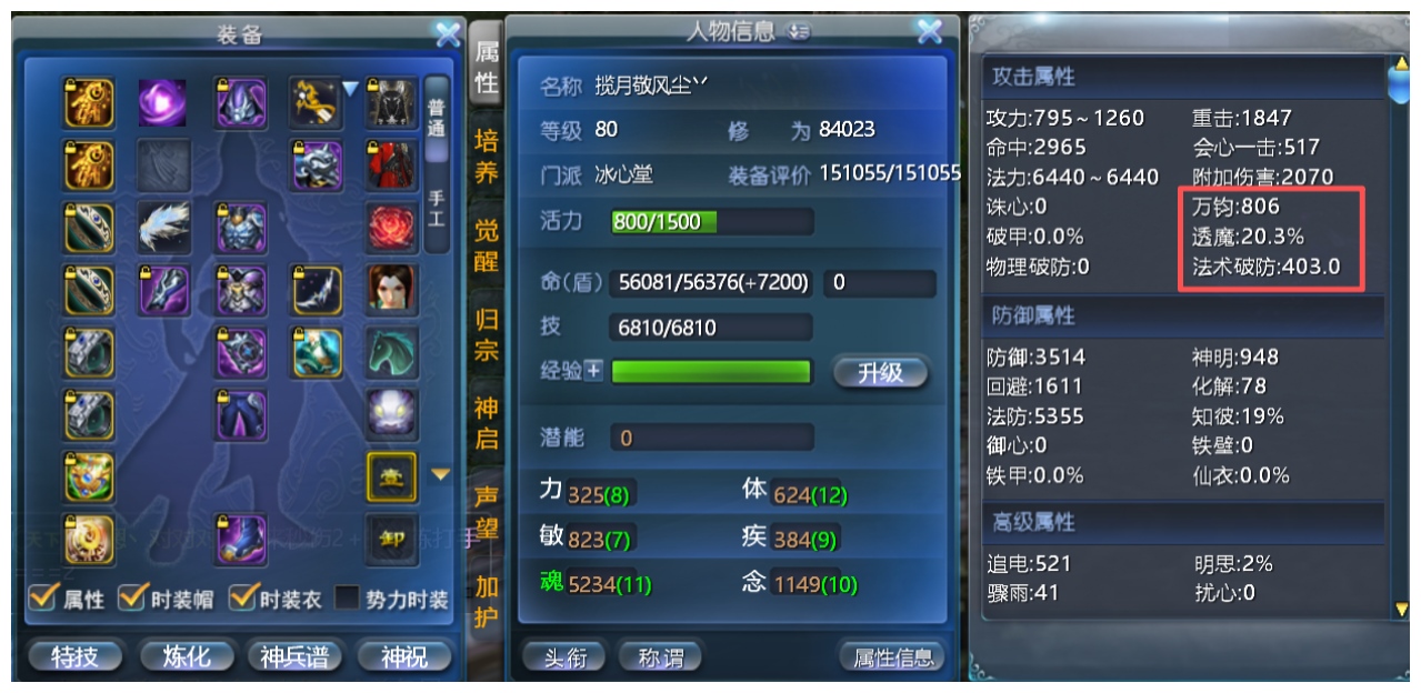 神启极品双18小法毒医 极限小法7025+ 万钧693+(九鼎最高800+万钧) 重击1835+ 附毒2199+ 人祸15 透魔15.6(九鼎点化24%透魔) 双孩子武学10 手工时装(万钧31+30+) 九鼎系统(多套晶符万钧小法 三套天魄双小法+小法破魔+小法知彼 点化双透魔+双明慧) 伤害防护+完封 2套双18装备 无封钻 两套完美大毒威力炼化 副本秒伤高