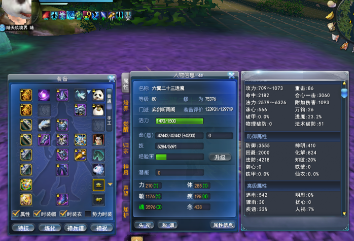 角色特点:青花玄素 2个翅膀+1染色 六翼4600金尺寸二代太初 物理防护完封 566诛心 23.2%透魔 6%透魔副手激活 20%知彼 游戏拆钻33%寄语 8大禹 知彼/透魔天魄 太初门派特技 孩子武学8 双透魔点化(九鼎有3个高数值双诛心点化)双会心天书 马丹双诛心 组合透魔2.4% 灵曜诛心透魔 组合透魔3.1% 人物满级 画卷单满 鱼狐狸双合体