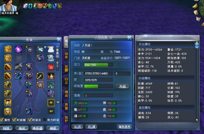 角色特点:新飞行翅膀+新龙坐骑 5000金尺寸六翼2代太初 护心完封 420万钧 22.7%破甲 118物理破防 5.5%破甲副手激活 双太初武器 太初门派特技 8大禹 5级4条破甲天魄 孩子武学9 双破甲点化 双万钧天书 翅膀通溟单破甲 鱼鬼双合体 画卷单满 强化12级 单破甲灵曜 破甲组合1.8% 英魂3个100级 特技重甲击 77手工套