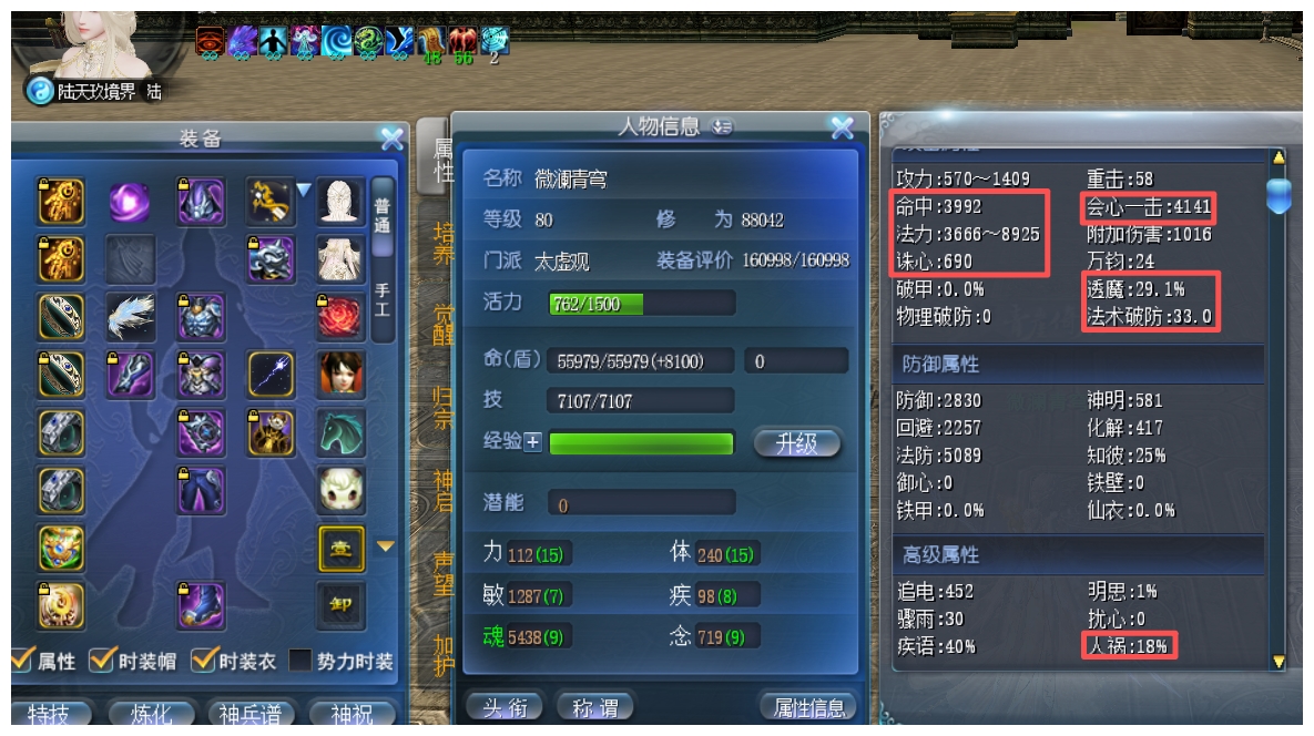 神启双20极品会心太虚 全身全满技能威力炼化(大风10% 符惊10.5% 破技10%)武器21钻双人祸(门派+移形换影) 大法8925+ 会心4141+ 诛心690+ 透魔29.1% 人祸18%+ 知彼25+ 极品英魂(魂104+ 大法49+) 势力副手6%透魔 (弈剑副手5.5% 可转职 多套炼化) 手工时装(双32+31诛心+双大生命) 画卷强化173%三满(洗炼透魔2.7%+2%) 5个极品双透魔灵曜 + 极品马灵化 全8级马丹(透魔1.8%)诛心159+ 大年卡+小年卡勋章200+ 武库:80手工套完美炼化~