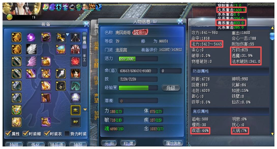 双武学10 + 5星极品太初(双魂双万钧) + 全双透魔+装评点化 6个万钧点化 + 极品双万钧天书 3个8级 1个9级(参悟6%透魔)