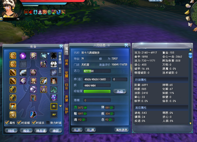 角色特点:双十八拆钻会心天机 11W风华值 青花玄素 9个翅膀(包含3个飞行翅膀)2950金纹路双紫1代太初 3100特权双金双紫2代太初 拓本狂斩天下 护心完封物理防护 455诛心 16.6%破甲 5%人祸 背包有护心+2耳环和另外2件战场套 2套装备可任意搭配护心特技 8大禹 全身战场套会心+人祸 副手5.5%破甲激活 孩子武学9 双诛心/破甲点化 双会心天书 翅膀通溟诛心/破甲 707分配鱼珠子+四象10 696分配老虎珠子+四象7 幻化嫦娥 灵光一闪20 灵曜破甲组合2.9% 双破甲点化/诛心破甲灵曜 英魂3个100级 特技重甲击+13 77副本套(加护15炼护13)