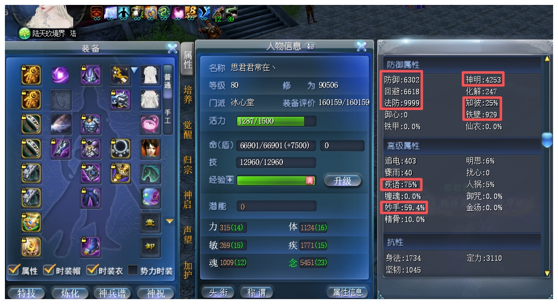 神启全战场极品BX 妙手威力10% 清明10% 全战场套25知彼+ 妙手加成59.4% 超高四维 铁壁929+ 寄语75% 极品马灵化+手工套+世界套+战场套 天魄7知彼妙手(二套天魄三金装评)