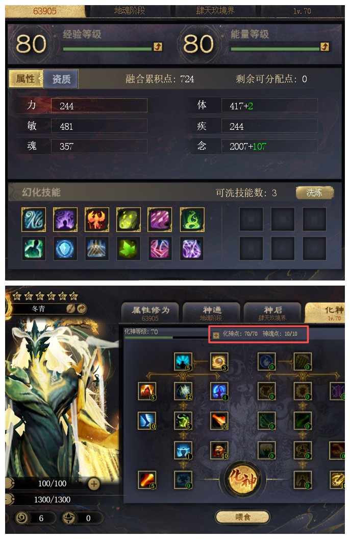 724分配6星合体树 化神70+ 神魂点10 + 5星650合体花 + 6星640合体鬼 + 5星609炎妖合体
