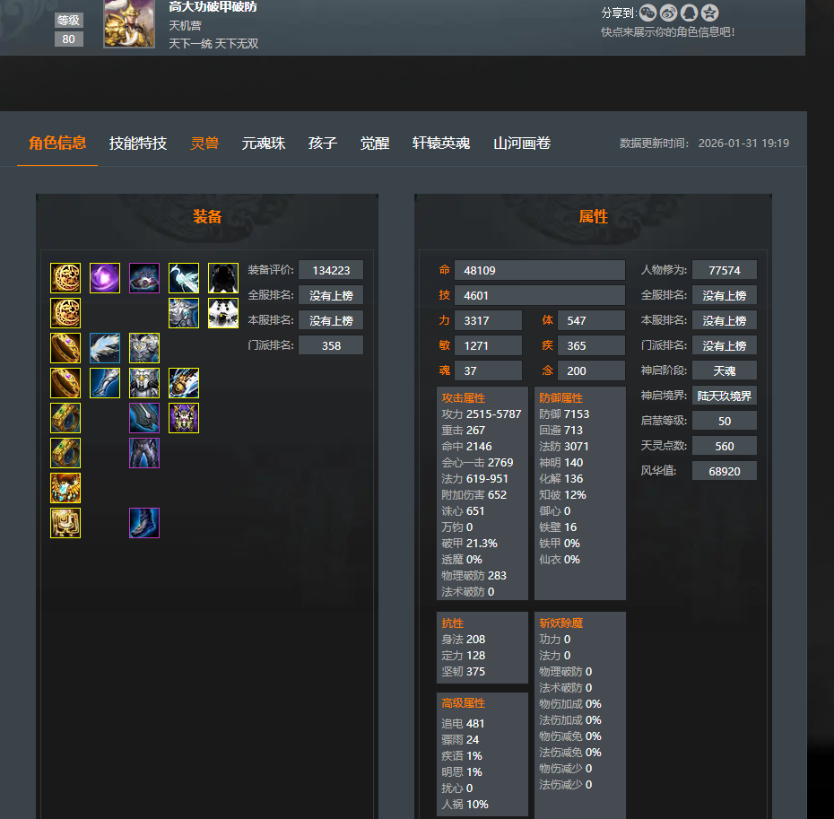角色特点: 青花玄素 5000尺寸双金2代太初 651诛心 21.3%破甲 283物理破防 10%人祸 完封物理防护 双太初武器 太初门派特技 天魄组合破甲 物理破防天魄 孩子武学8 破甲点化 双会心天书 翅膀通溟1个破甲 老虎合体 灵光一闪18 双诛心马丹 破甲组合2.5% 画卷单满 强化15级 单破甲灵曜 破甲组合2.8% 英魂3个100级 特技重甲击 77副本套(加护14炼护13)