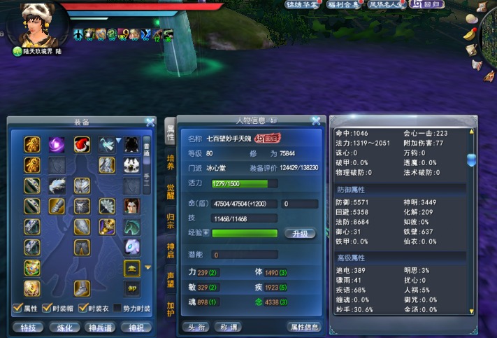 角色特点:青花玄素 2个翅膀 2代4600金尺寸太初 物理火元防护完封 637铁壁 拆钻68%寄语 30.6%妙手 副手11%妙手激活 炼护十六孔 8大禹 双太初武器 5个4条妙手天魄 孩子武学8 1个双明慧点化 6级双铁壁天书 翅膀通明2个铁壁 花草合体 灵光一闪18 双铁壁马丹 画卷单满 强化12级 1个双铁壁灵曜 武库还有一套战场套 77副本套 价格1.79万
