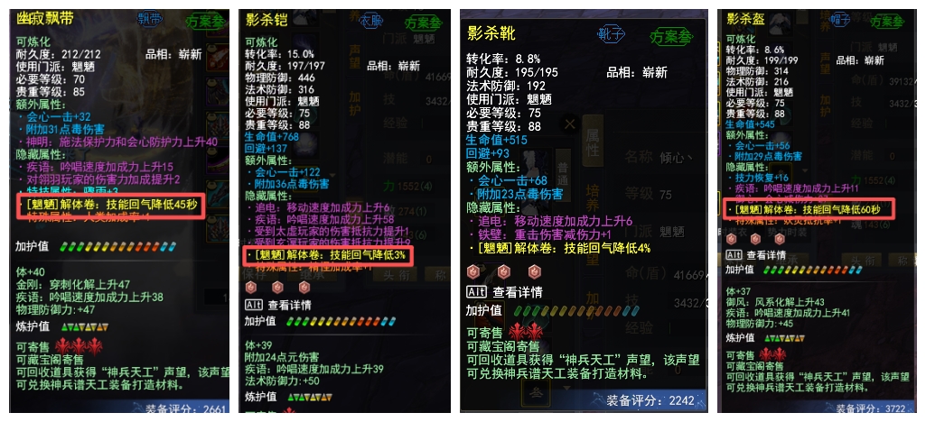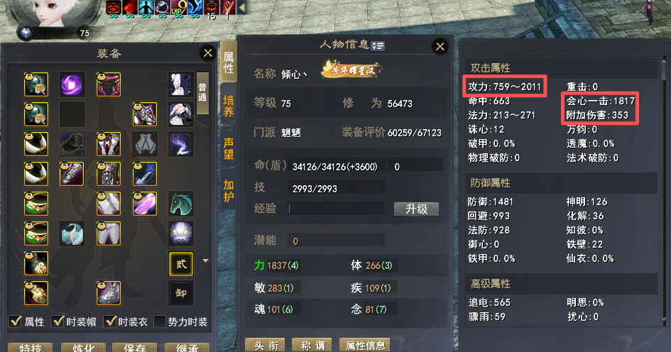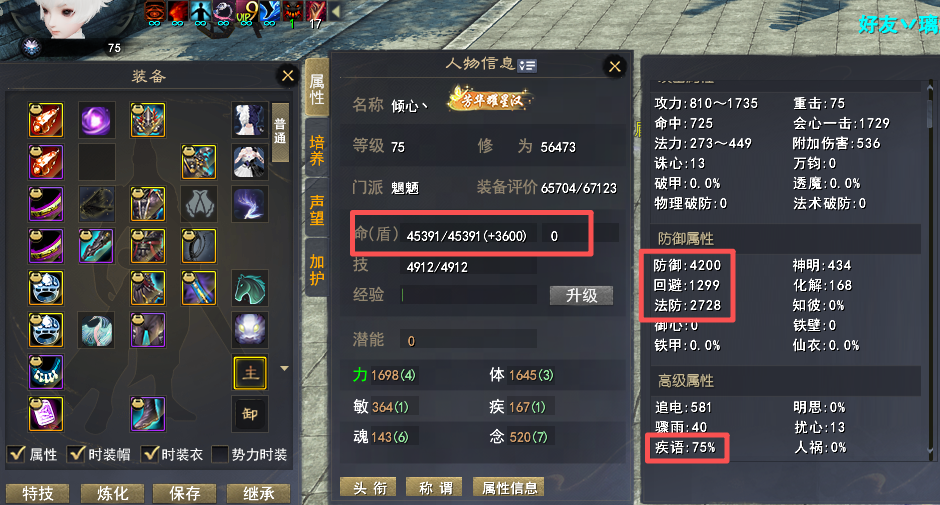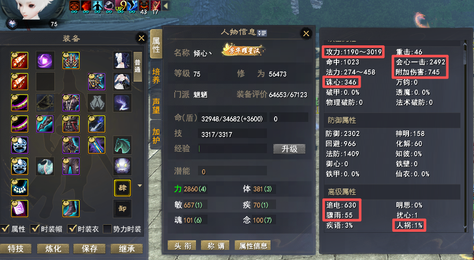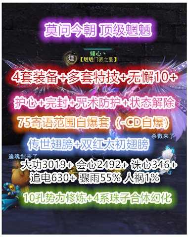 【莫问今朝】顶级魍魉 多套装备+多套特技 特技:护心 完封 咒术防护 状态限制解除 无懈10+ 大攻3019+ 会心2492+ 诛心346+ 骤雨55 人祸1% 6个江湖(三个三境界) 势力修炼高(10孔)觉醒113级(8个技能10)极品自爆套(自爆-CD套装 寄语75% 常驻范围特技)极品副本套