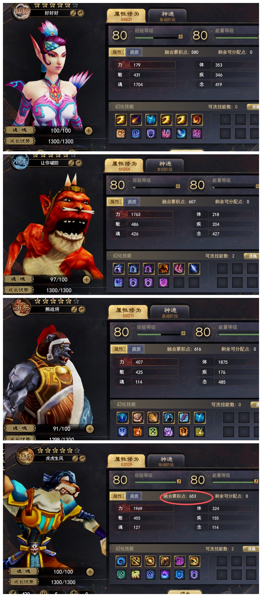 653分配合体老虎 + 607分配合体鱼 +580超气狐狸 + 616分配5星(完美技能)