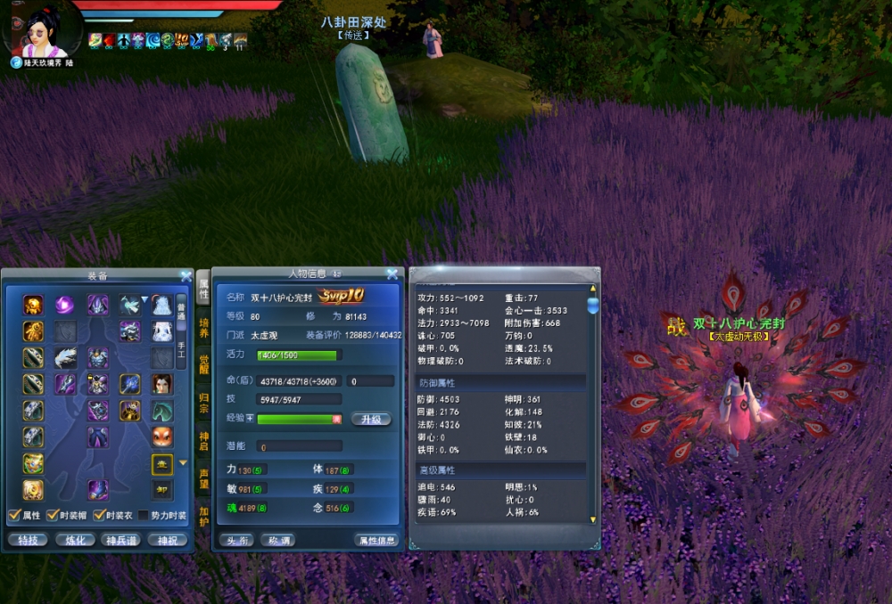 角色特点:双十八拆钻号 青花玄素 浮光饰件 星海符惊 4800尺寸2代太初 护心完封2境界钝刺防护 708诛心 23.5%透魔 21%知彼 副手透魔5.5% 8大禹 双太初武器 6级4条天魄 天魄组合透魔(定身咒30.5%透魔)孩子武学9 双透魔点化 双会心天书 翅膀通溟2个透魔 6星651分配四象9合体鱼珠子 势力修炼技能6条 2匹灵兽灵化(一匹会心一匹大法)一闪17 诛心马丹 画卷双满 强化12级 单透魔灵曜 灵曜组合透魔1.7% 77手工套