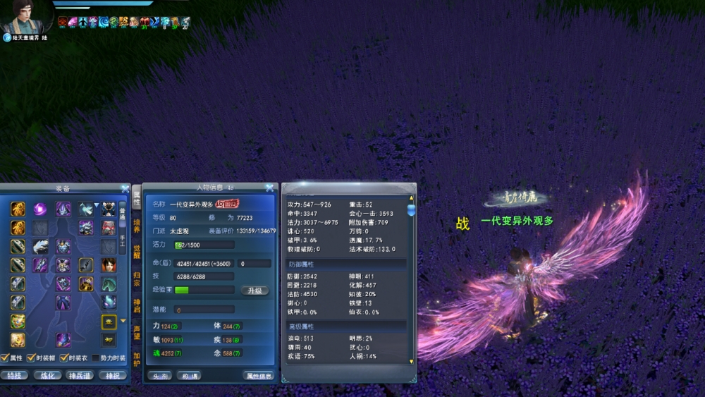 角色特点:12个翅膀 1代金尺寸金纹路变异太初 炼护16孔 全身298可交易钻 法术钝刺防护(玉佩差个挥砍+4就有伤害防护了)520诛心 17.7透魔 14%人祸 神速75%满寄语 双4星太初武器 太初门派特技 4条天魄 孩子武学10 双透魔/透魔明慧点化 双会心天书 翅膀通溟诛心透魔 鱼合体 灵光一闪19 诛心马丹 画卷双满 强化12级 1个双透魔灵曜 英魂3个100级 特技圣灵 背包还有一套世界套+77副本套