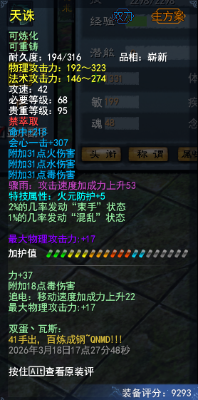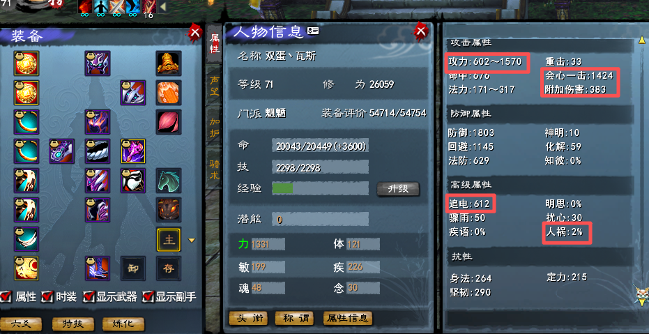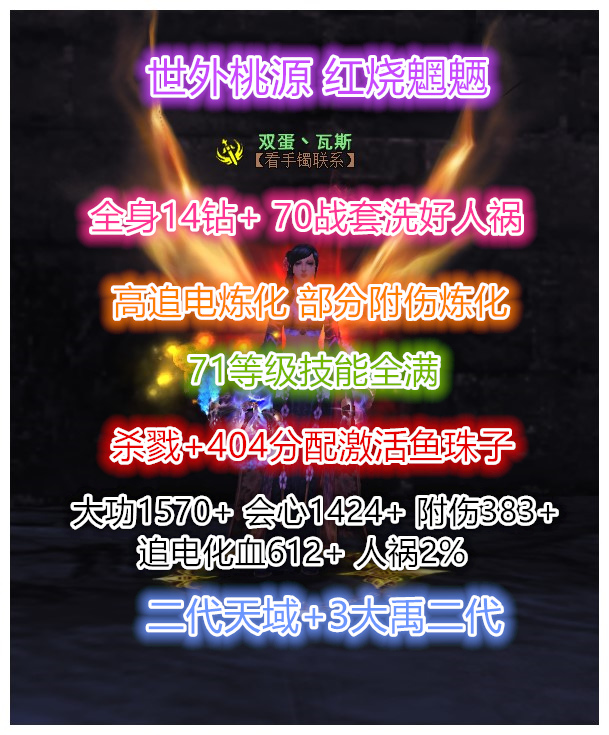 【经典服】世外桃源 红烧魍魉 全身14钻 二代天域(完美四条炼化)高追电炼化 部分附伤炼化 + 二代3大禹 70战4件洗好人祸 等级71级(3系人物技能全点满) 杀戮 75级马(贰境界顺隐马) 大攻1570+ 会心1424 附伤383+ 人祸2% 4星402激活鱼珠子