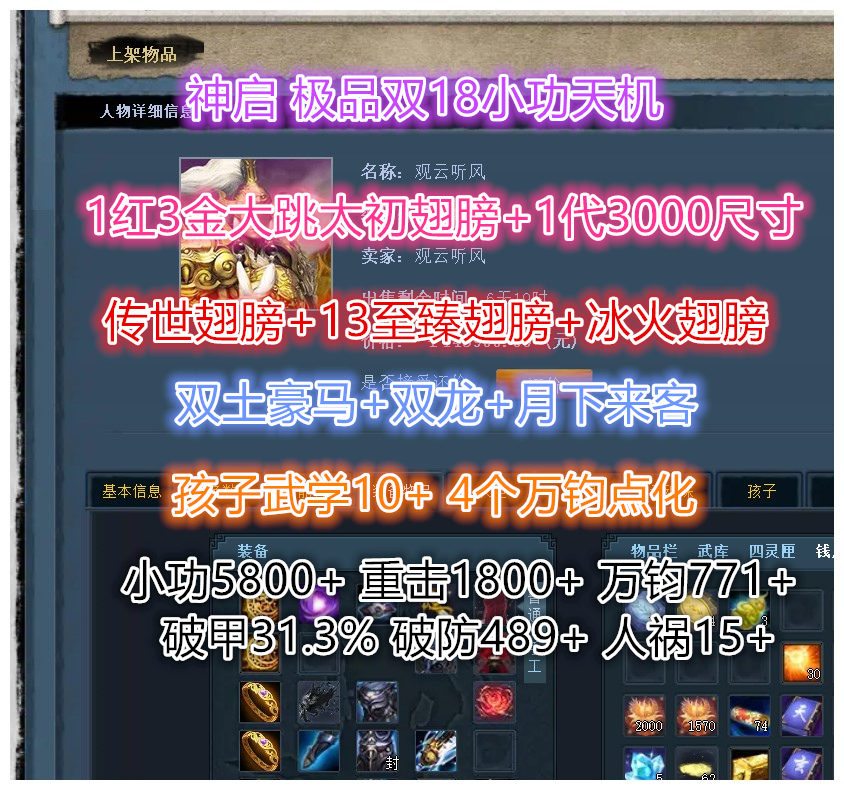 神启【双18/极品小功天机】部分20钻 全威力炼化 副手6%破甲 武学10 小攻5800+ 重击1800+ 万钧771+ 破甲31.3% 破防489+ 人祸15+ 4个万钧点化 34万风华值 轻甲击21+ 大跳太初 双土豪马+双龙