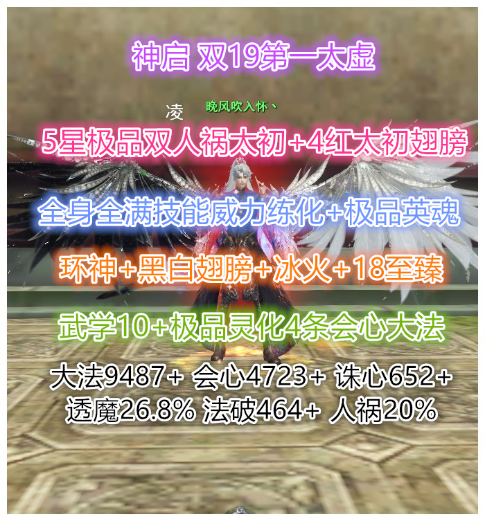 神启【双19/顶级太虚】 21钻5星太初 全身双护19钻 全身全满技能威力 大法9487+ 会心4723+ 诛心652 透魔26.8% 法破464+ 人祸20% 极品马灵化 4条会心大法 画卷三满强化193% 四红太初翅膀 + 环神 +