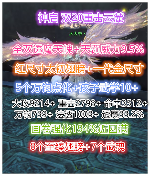 神启【双20/重击云麓】天罚威力炼化9.5% 全双透魔天魄 大法9214 + 万钧739+ 透魔33.2%(法透1003+) 重击2798+ 寄语65% 人祸12+ 画卷强化194%近4满 7孔修炼 5个万钧点化 武学10+