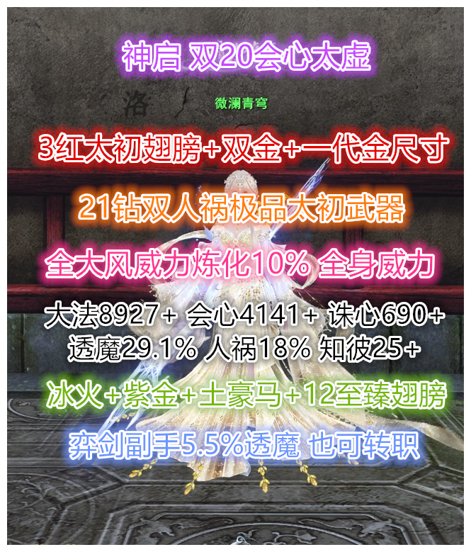 神启【双20/会心太虚】21钻双人祸太初 全满威力炼化 大法8925+ 会心4141+ 诛心690+ 透魔29.1% 人祸18%+ 知彼25+ 全8级马丹 3红极品太初翅膀 土豪马