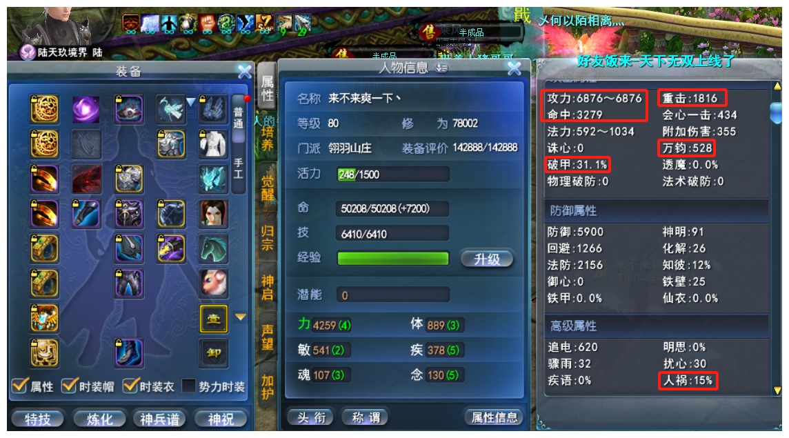 神启双18小攻羽毛 全身技能威力炼化(野狼梨花倦鸟芭蕉)大年卡 双至臻翅膀 6级天魄双小攻+双骤雨 小攻6877+ 重击1816+ 命中3279+ 万钧528+ 破甲31.1% 人祸15%+ 势力副手6%破甲 极品手工时装(万钧30+31+) 极品英魂(力93+ 小攻52+)画卷强化136%双满 5个6级极品灵曜(双破甲+破甲万钧)极品马灵化(破甲1.5%)小攻135+