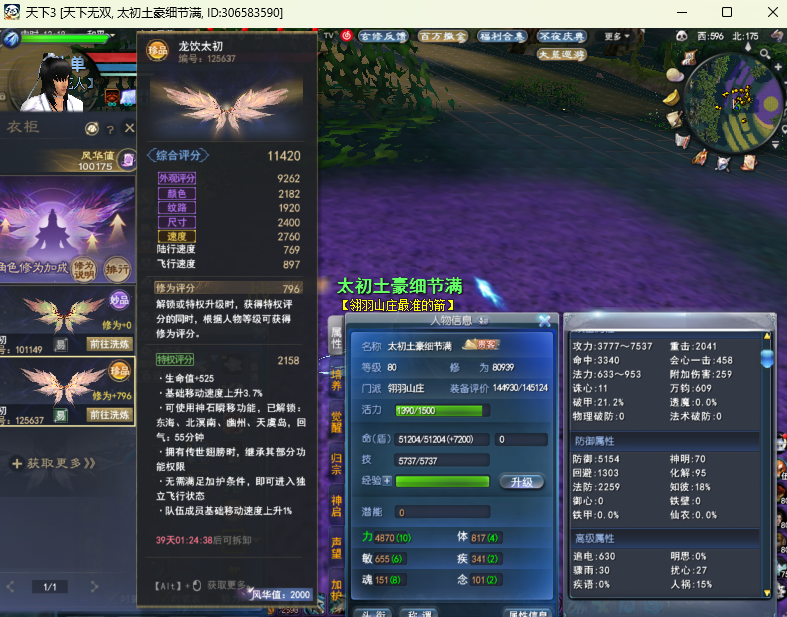 角色特点:青花玄素 3个翅膀 10W风华值 鹤游梨花技能风格 10月份刚买的大年卡 609万钧 21.2%破甲 15%人祸 钝刺护心完封 14.5W高装瓶 接近8W1高修为 3代土豪马 全战场套21人祸洗好 极品双万钧太初武器 顶级太初武器特技(门派特技+斗战变) 孩子武学8 破甲点化 6级双万钧天书 6级双骤雨天魄 3个700分配合体珠子(老虎710鬼701鱼714)650分配完美技能合体的狐狸珠子 幻化马王爷 画卷单满(小工和命中强化一半) 强化15级 灵光一闪20 力资质马丹 英魂3个100级 77武器手工副本套(可分期购买 首付30% 付清过户)