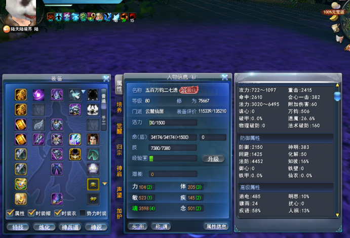 角色特点:青花玄素 物理防护完封 双十八拆钻法师 506万钧 26.6%透魔(孩子翅膀通溟没出透魔 还有个单透魔点化 提升下可以到28.5%透魔)拆钻58%寄语 13%人祸(战场套激活4件寄语+4件人祸)160法术破防 透魔/大法天魄 天魄组合透魔(水入梦有32.1%透魔)孩子武学8 双透魔点化 6级双万钧点化 四书4.2%透魔接近满 5级双透魔/透魔万钧灵曜(升级6级透魔万钧还可以大提升)组合透魔2.8 灵光一闪20 魂资质+2马丹 组合透魔2.0 画卷单满 强化15级 鱼狐狸双合体 九鼎有一套接近完美的重击鬼墨炼化 英魂3个100级 价格2.59万