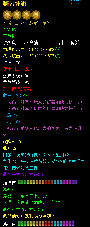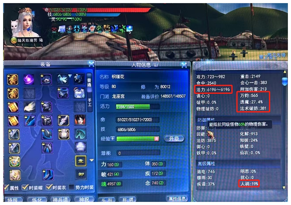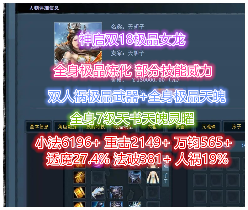 神启双18极品小法重击女龙 武学10 部分曼珠技能威力 小法6196+ 重击2149+ 万钧565+ 透魔27.4% 人祸19+ 极品手工双万钧30+25+ 画卷强化169%(双透魔+万钧透魔+双万钧) 缠魂11% 极品20钻双人祸太初武器 全身极品天魄 全身7级天魄天书灵曜