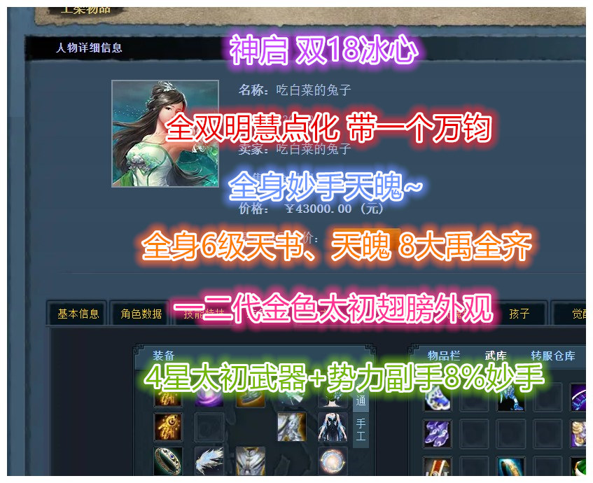 神启双18冰心 四星太初武器 副手8%妙手 双大禹手镯成品 全身6级妙手天魄 满级觉醒完封 武库:完美炼化77副本套