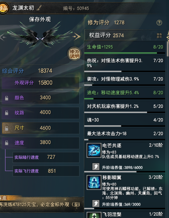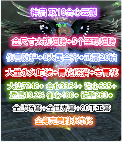 二代金尺寸太初翅膀 + 5个至臻翅膀 + 大量XZX永久时装 新青花熊猫+老青花 + 武魂3个 +(13.6万风华值 )