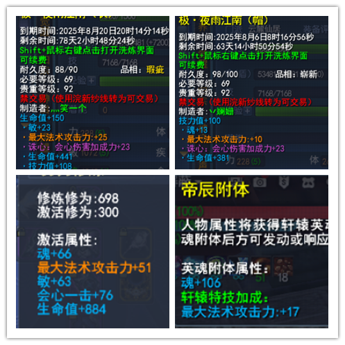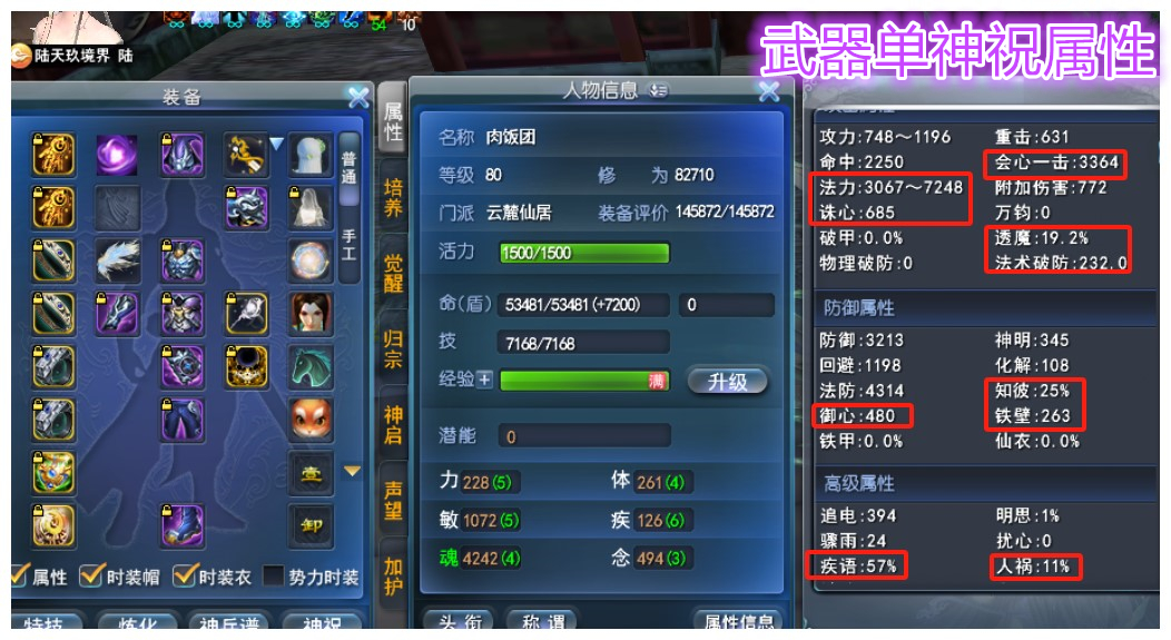 神启双18会心云麓 全身完美附水炼化(部分威力) 知彼寄语20钻武器 副手5.5%透魔+ 大法7248+(就武器单神祝) 会心3364+ 诛心685+ 透魔19.2% 法破232+ 人祸11%+ 知彼26+ 高双心铁壁 英魂(魂106+ 大法17+) 全身天魄6~7级(知彼透魔+知彼) 手工时装(诛心双23+生命) 双大禹手镯 画卷强化132%双满 5个灵曜诛心透魔+透魔铁壁(洗练3.1%+1%) 马灵化 透魔1.2% 极品双诛心马丹 武库:世界套+80手工套+3代天域弓