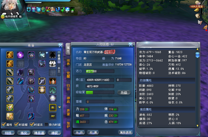 青花玄素 1个翅膀+染色 伤害防护完封 412万钧 318御心 13.5%透魔 15%人祸 20%知彼 8大禹 战场套完美激活 知彼天魄 4星双万钧太初武器 太初门派特技 孩子武学8 双透魔点化 单万钧天书 灵光一闪17 鱼合体 幻化嫦娥 画卷单满 77副本套