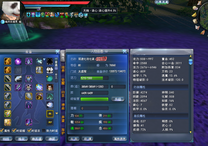 角色特点:青花玄素 1个翅膀 四翼5600红纹路二代太初 物理防护完封 718诛心 13.6%透魔 9%人祸 拆钻37%寄语 5-6级知彼/透魔天魄 双4星太初武器 太初移形换影特技 孩子武学9 双诛心点化 翅膀通溟2个诛心 狐狸杀手双合体 灵光一闪16 透魔组合1.8% 画卷单满 强化12级 4条透魔灵曜 天魄特技诛心(定身咒后809诛心)英魂3个100级 特技惊天+11(加魂特技)背包有另外2件战场套 武器18钻17户(价值1200R)
