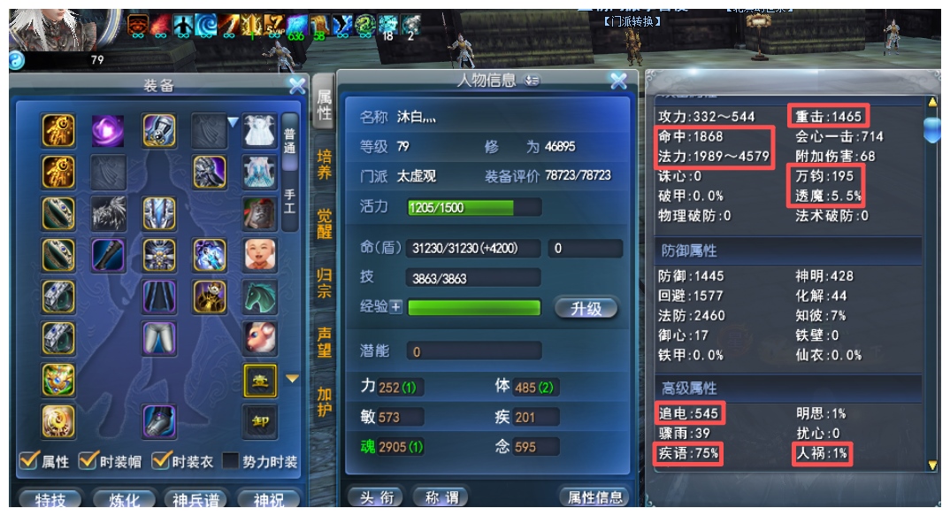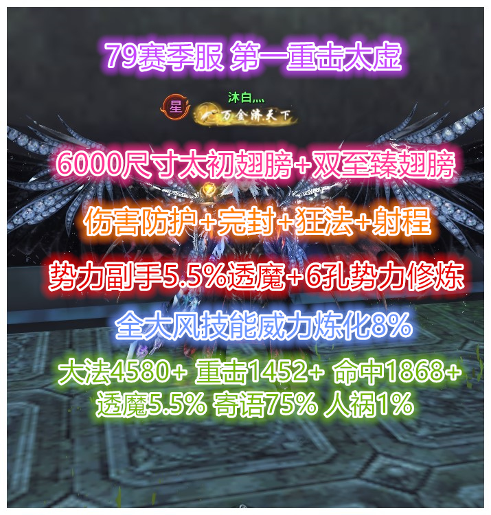 【79赛季服】 第一重击太虚 全大风技能威力炼化8% 特技: 完封+伤害防护+狂法+射程 势力修炼高 6孔 贰境界云华马 大法4580+ 万钧195+ 重击1452+ 透魔5.5% 寄语42% 8大禹洗练极品 年卡权益2029年8月 仓库:大量雷钻+红钻 贰境界杀戮 势力副手5.5%透魔