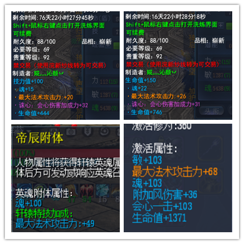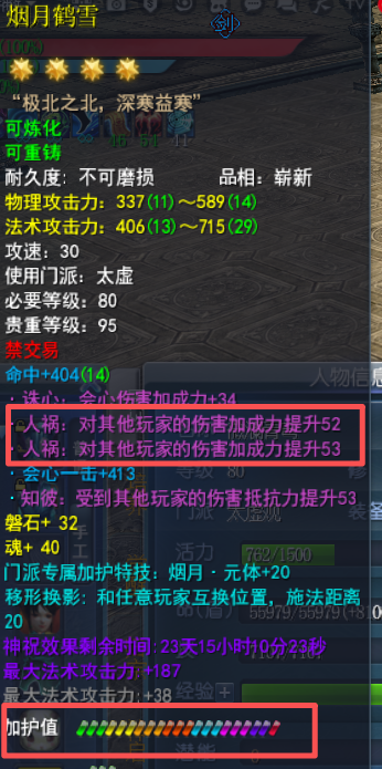 神启双20极品会心太虚 全身全满技能威力炼化(大风10% 符惊10.5% 破技10%)武器21钻双人祸(门派+移形换影) 大法8925+ 会心4141+ 诛心690+ 透魔29.1% 人祸18%+ 知彼25+ 极品英魂(魂104+ 大法49+) 势力副手6%透魔 (弈剑副手5.5% 可转职 多套炼化) 手工时装(双32+31诛心+双大生命) 画卷强化173%三满(洗炼透魔2.7%+2%) 5个极品双透魔灵曜 + 极品马灵化 全8级马丹(透魔1.8%)诛心159+ 大年卡+小年卡勋章200+ 武库:80手工套完美炼化~