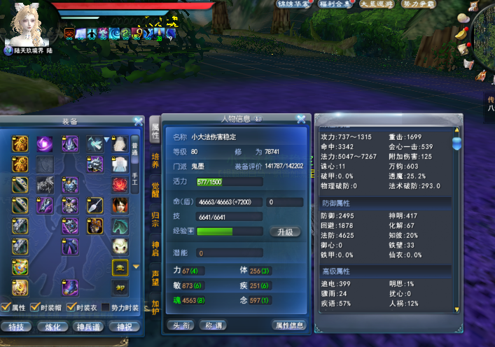 角色特点:新飞行翅膀 物理防护完封 护心+3手镯 603万钧 25.2%透魔 12%人祸 293法术破防 57%寄语 大小法伤害稳定 6级知彼/透魔天魄 人物双寄语+孩子双万钧太初武器 太初门派特技 6条势力技能修炼 孩子武学9 双透魔点化 1个万钧点化 6级双万钧天书 狐狸炎妖鱼杀手4个合体 幻化二郎神业火 完美4条魂资质+2马丹 灵光一闪20 透魔组合2.3% 画卷双满 强化15级 双透魔/透魔万钧灵曜 英魂3个100级 特技神灵 77手工套 底子号 可以到30%透魔(灵曜组合透魔+马丹升6级+孩子天魄透魔组合+孩子四书一个参悟点+孩子一个翅膀通溟洗出透魔)