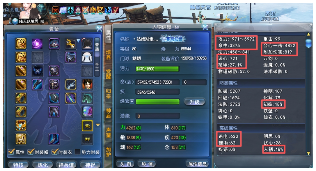 极品双18WL全战场 双19钻双人祸极品太初 势力副手6%破甲 全身技能威力炼化(影杀8%狂影9%回环10%)手工时装+大生命+诛心 极品英魂(敏104+ 大攻56+)画卷双满强化168% 极品灵曜(双破甲+破甲诛心等)极品天魄(双骤雨大攻/命中)极品马灵化(双诛心完美马丹) 极限输出属性:大攻5992+ 会心4822+ 命中3376+ 诛心721+ 破甲27.1% 人祸18% 知彼18+ 武库:全自爆套74%寄语 全80手工套+18钻九天武器