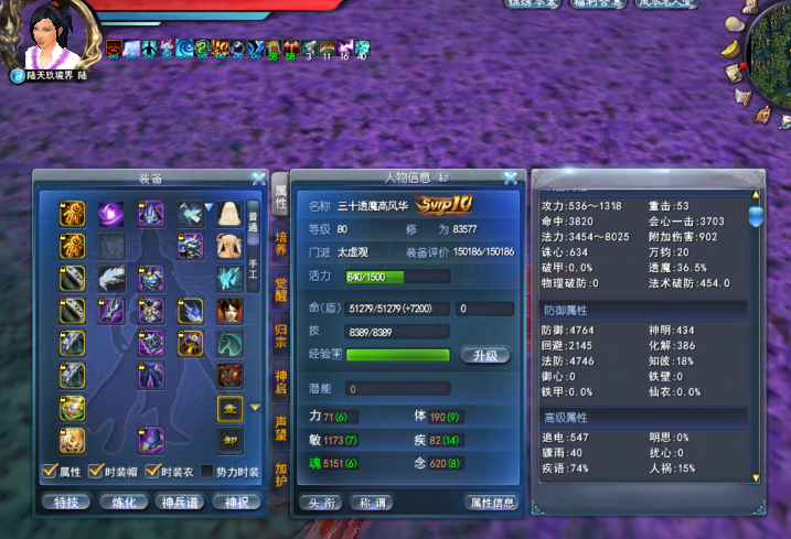 角色特点:18个翅膀 1代2880金尺寸 2代5100红颜色太初 20.4W风华值 4个大风技能特效 1代土豪马 新神临时装 小年卡+大年卡+太初年卡 护心完封物理防护 634诛心 29.5%透魔(副手洗个5.5就30%透魔了或者升级2个7级灵曜) 450法术破防 15%人祸 游戏全神祝8050大法 大风+符惊技能威力 7条势力技能 全身付风完美炼化 8大禹 双太初武器 太初门派特技 6-7级透魔天魄 天魄组合透魔 孩子武学9 魂双诛心/双透魔点化 双会心天书 翅膀通溟双诛心/诛心透魔 炎妖鱼狐狸3个合体 幻化嫦娥 灵光一闪20 7级双诛心马丹 透魔组合3.7% 画卷3满 强化15级 6级双透魔灵曜 透魔组合3.1% 英魂3个100级 特技圣灵+18 77副本套(加护16-18)