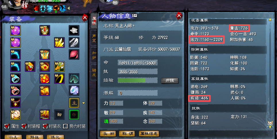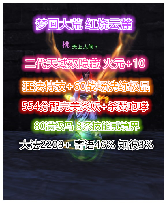 【经典服】梦回大荒 红烧云麓 二代天域双隐藏(火元防护+10) 二代3大禹 60战场套洗练极品(满寄语或双隐藏) 知彼3% 等级68级(经验72%)(3系人物技能全点满) 杀戮+咆哮 80高等级马(3系技能全贰境界) 大攻2209+ 重击726+ 寄语46% 知彼3% 4星554完美技能炎妖