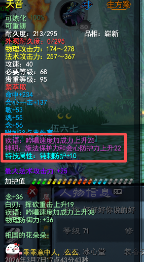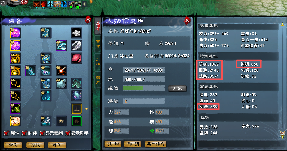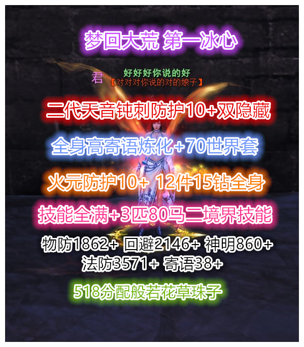 【经典服】梦回大荒 第一冰心 12件15钻 二代天域双隐藏(钝刺防护10+)全身70世界套 全身高寄语 二代3大禹 副本首饰毕业(火元防护+10) 等级71级 (3系人物技能全点满) 杀戮+咆哮 3匹马全80级(3系技能全贰境界) 物防1862+ 回避2145+ 法防3571+ 寄语38+ 5星518般若花草幻化激活